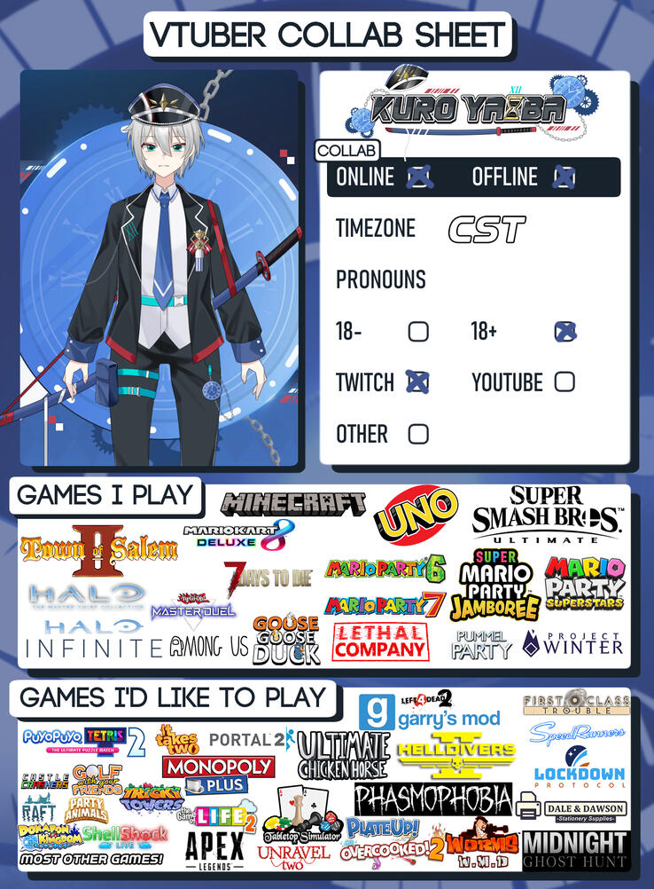 Hello, I am Kuro Yaiba, a time-traveling VTuber! I play a wide variety of games, most of which involve me getting punished by RNG's whims. Nice to make your acquaintance!